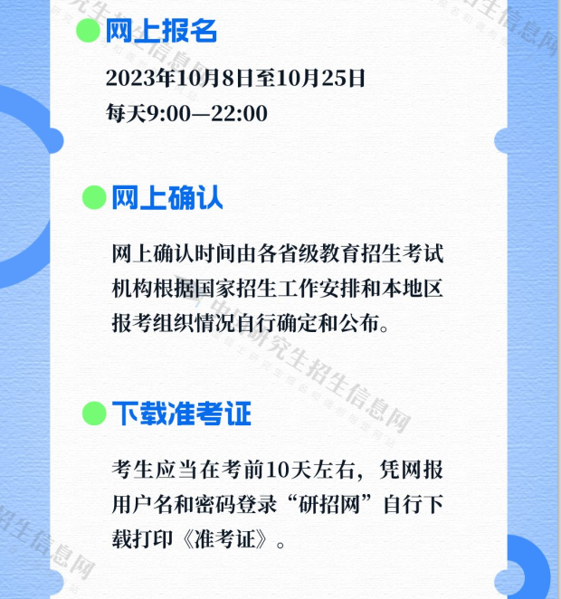 《规定》明确,2024年全国硕士研究生招生考试初试定于2023年12月23日至24日,考试时间超过3小时或有使用画板等特殊要求的少数考试科目安排在12月25日。网上报名工作安排在2023年10月8日至10月25日(每天9:00~22:00),预报名工作安排在9月24日至9月27日(每天9:00~22:00)。网上报名结束后,各省级教育招生考试机构将组织网上确认工作,对考生报名信息进行审核。所有考生均须在规定时间内参加网上报名和网上确认,逾期不再补办。