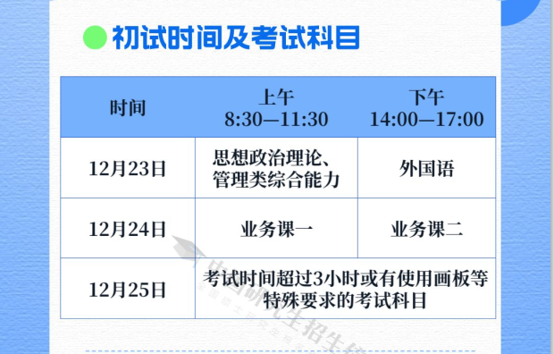 教育部近日印发《2024年全国硕士研究生招生工作管理规定》(以下简称《规定》),部署各地各招生单位做好2024年全国硕士研究生考试招生工作。2024年全国硕士研究生招生考试初试定于2023年12月23日至24日,考试时间超过3小时或有使用画板等特殊要求的少数考试科目安排在12月25日。