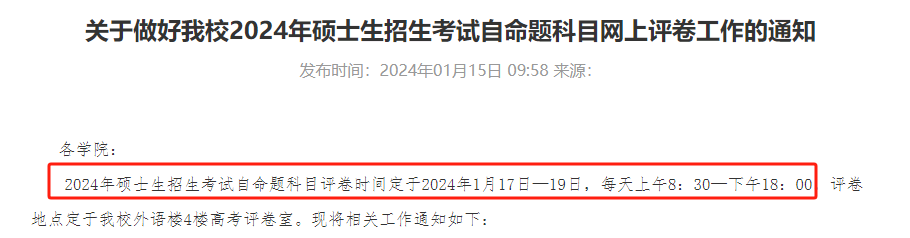 安徽农业大学2024年硕士招生考试评卷时间定为1月17-19日,也就是说安徽农业大学的阅卷已经在前几天完成啦