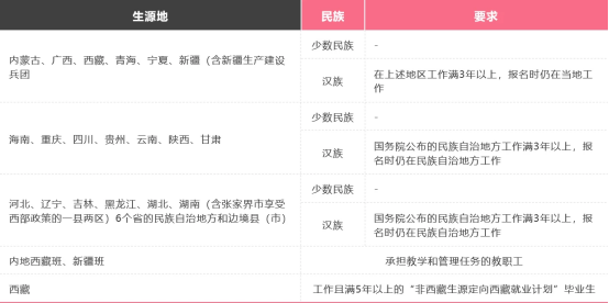 1. 生源地在内蒙古、广西、西藏、青海、宁夏、新疆(含新疆生产建设兵团)的少数民族考生,以及在上述地区工作满3年以上,报名时仍在当地工作的汉族考生。