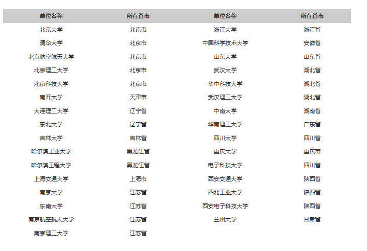 北京大学、中国人民大学、北京师范大学、中国政法大学、天津大学、吉林大学、四川大学、西南交通大学、西南财经大学、西北农林科技大学